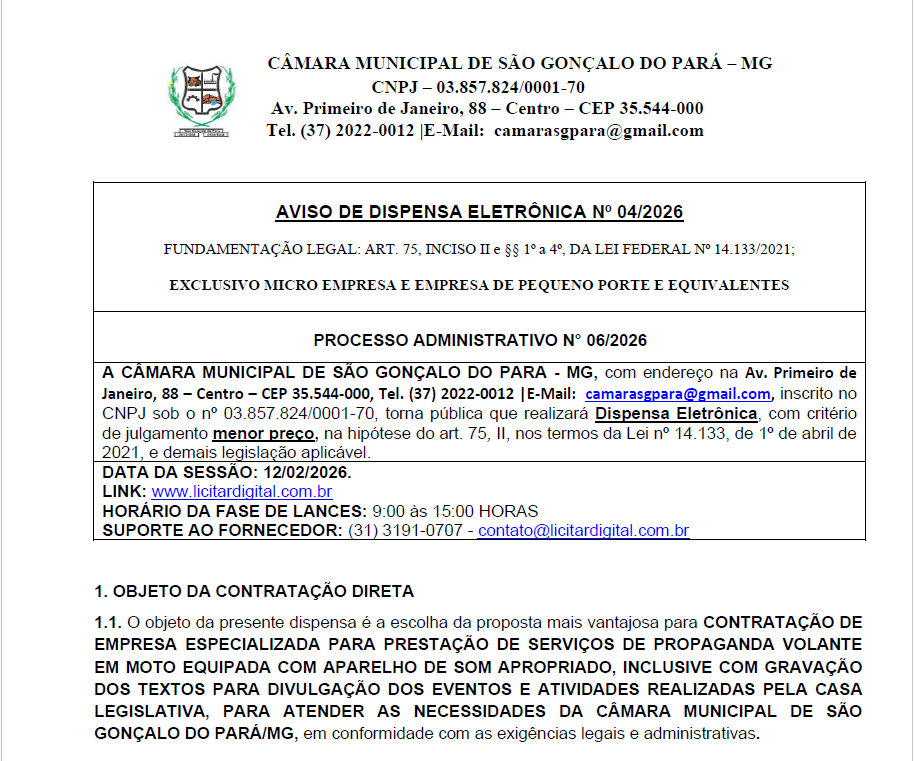 1.1. O objeto da presente dispensa é a escolha da proposta mais vantajosa para CONTRATAÇÃO DE EMPRESA ESPECIALIZADA PARA PRESTAÇÃO DE SERVIÇOS DE PROPAGANDA VOLANTE EM MOTO EQUIPADA COM APARELHO DE SOM APROPRIADO, INCLUSIVE COM GRAVAÇÃO DOS TEXTOS PARA DIVULGAÇÃO DOS EVENTOS E ATIVIDADES REALIZADAS PELA CASA LEGISLATIVA, PARA ATENDER AS NECESSIDADES DA CÂMARA MUNICIPAL DE SÃO GONÇALO DO PARÁ/MG, em conformidade com as exigências legais e administrativas.