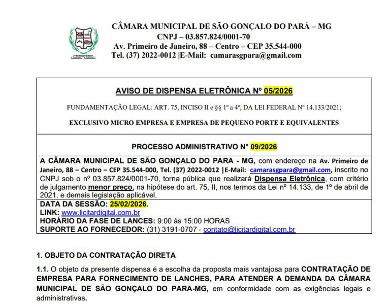 O objeto da presente dispensa é a escolha da proposta mais vantajosa para CONTRATAÇÃO DE EMPRESA PARA FORNECIMENTO DE LANCHES, PARA ATENDER A DEMANDA DA CÂMARA MUNICIPAL DE SÃO GONÇALO DO PARA-MG, em conformidade com as exigências legais e administrativas.