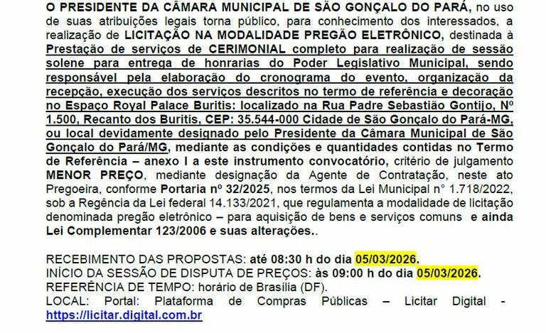 O PRESIDENTE DA CÂMARA MUNICIPAL DE SÃO GONÇALO DO PARÁ, no uso de suas atribuições legais torna público, para conhecimento dos interessados, a realização de LICITAÇÃO NA MODALIDADE PREGÃO ELETRÔNICO, destinada à Prestação de serviços de CERIMONIAL completo para realização de sessão solene para entrega de honrarias do Poder Legislativo Municipal, sendo responsável pela elaboração do cronograma do evento, organização da recepção, execução dos serviços descritos no termo de referência e decoração no Espaço Royal Palace Buritis: localizado na Rua Padre Sebastião Gontijo, Nº 1.500, Recanto dos Buritis, CEP: 35.544-000 Cidade de São Gonçalo do Pará-MG, ou local devidamente designado pelo Presidente da Câmara Municipal de São Gonçalo do Pará/MG, mediante as condições e quantidades contidas no Termo de Referência – anexo I a este instrumento convocatório, critério de julgamento MENOR PREÇO, mediante designação da Agente de Contratação, neste ato Pregoeira, conforme Portaria nº 32/2025, nos termos da Lei Municipal n° 1.718/2022, sob a Regência da Lei federal 14.133/2021, que regulamenta a modalidade de licitação denominada pregão eletrônico – para aquisição de bens e serviços comuns e ainda Lei Complementar 123/2006 e suas alterações, a ser realizado na Plataforma de Licitações Eletrônicas Licitar Digital www.licitardigital.com.br, no mesmo local encontra-se e edital e demais documentos.
