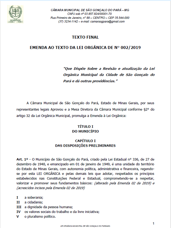 Lei Orgânica atualizada em 06 de Dezembro de 2019